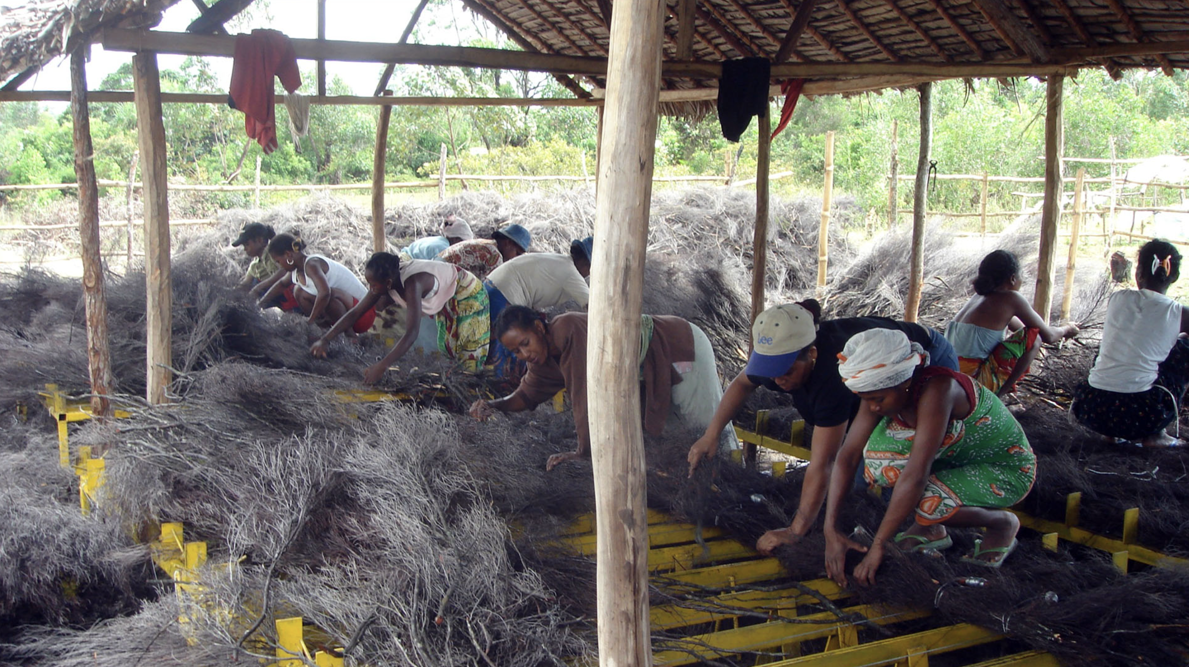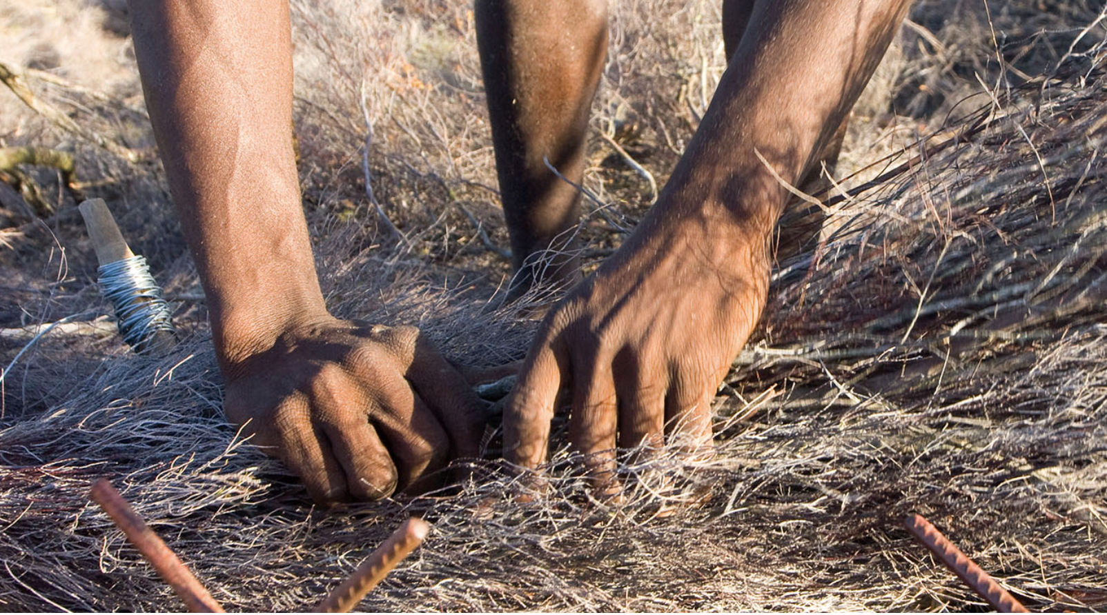 La brande est coupée, séchée quelques jours, puis conditionnée en fagots. Cette opération nettoie les sous-bois et préserve la biodiversité, favorise la repousse naturelle de la plante, crée de l’emploi local et prévient les risques d’incendie en entretenant les zones boisées. Étape 2 : Le tissage manuel