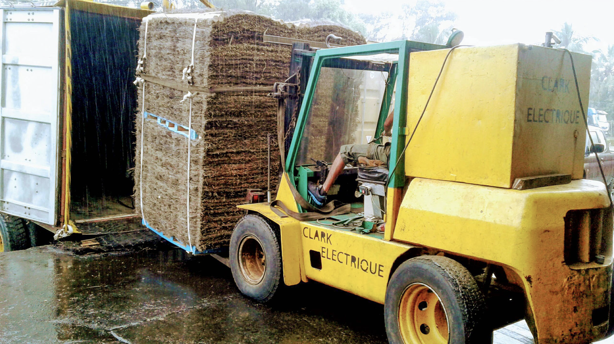 Les panneaux sont placés sur palettes en bois, compactés sous presse pour réduire le volume et optimiser le transport, aplatis pour une meilleure occultation puis sanglés et stockés à l’abri jusqu’à la vente finale.